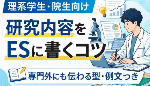 - 理系学生・院生向け|研究内容をESに書くコツ【専門外にも伝わる型】研究内容をESに書こうとすると、急に手が止まることがあります。 理系学生や院生にとって、研究内容は一番時間を使ってきたテーマである一方、いちばん「伝える形」に直しにくい項目でもあります。 結論から言うと、ESの研究内容で大事なのは、研究の難 …