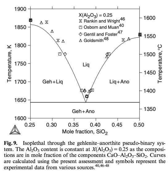 H. Mao, M. Hillert, M. Selleby, B. Sundman, “Thermodynamic assessment of the CaO–Al₂O₃–SiO₂ system” (J. Am. Ceram. Soc., 2006)、Fig.9より抜粋